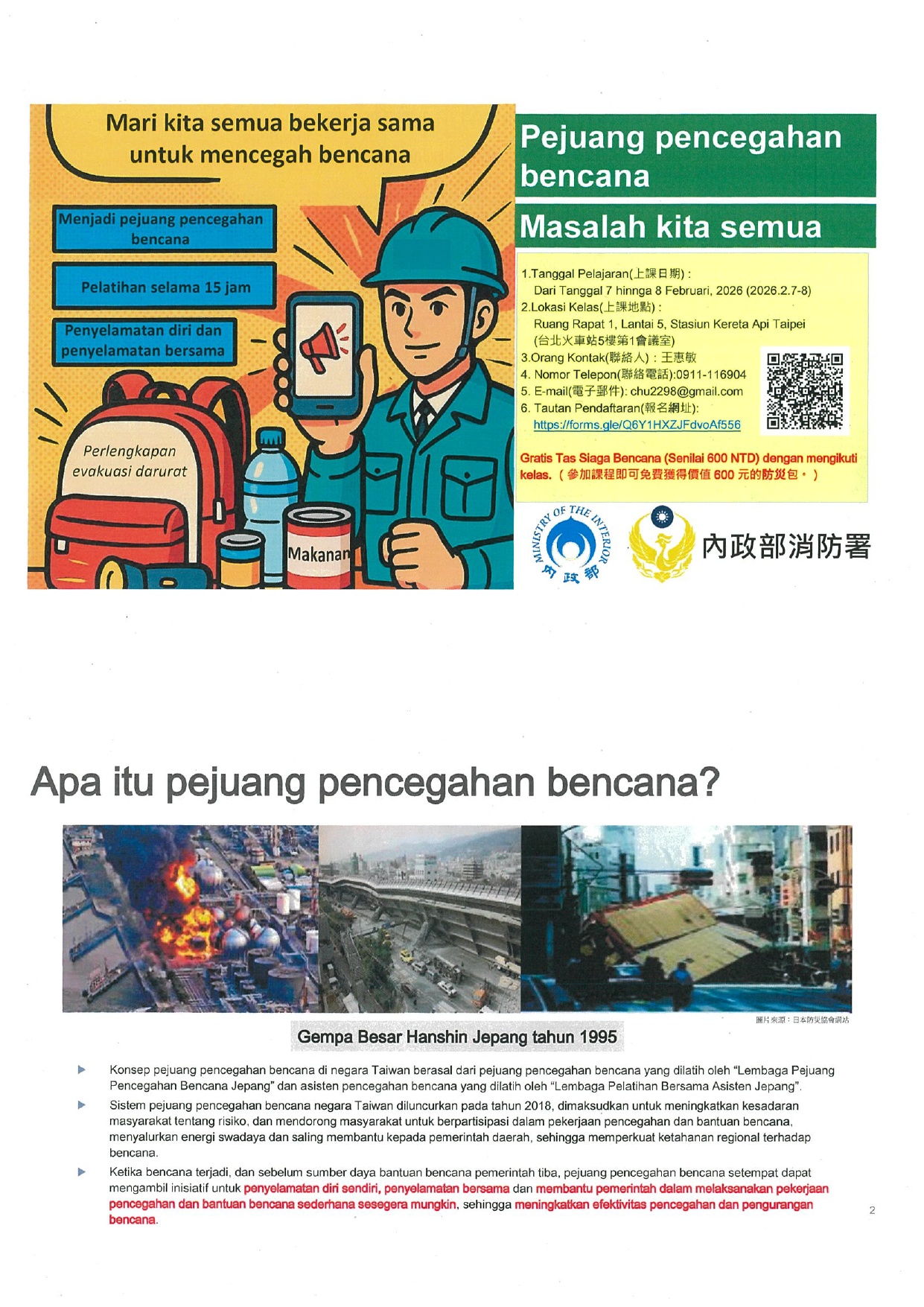 🔔重要通知🔔內政部辦理外籍看護移工防災士培訓專班Kelas Pelatihan Sukarelawan Penanggulangan Bencana