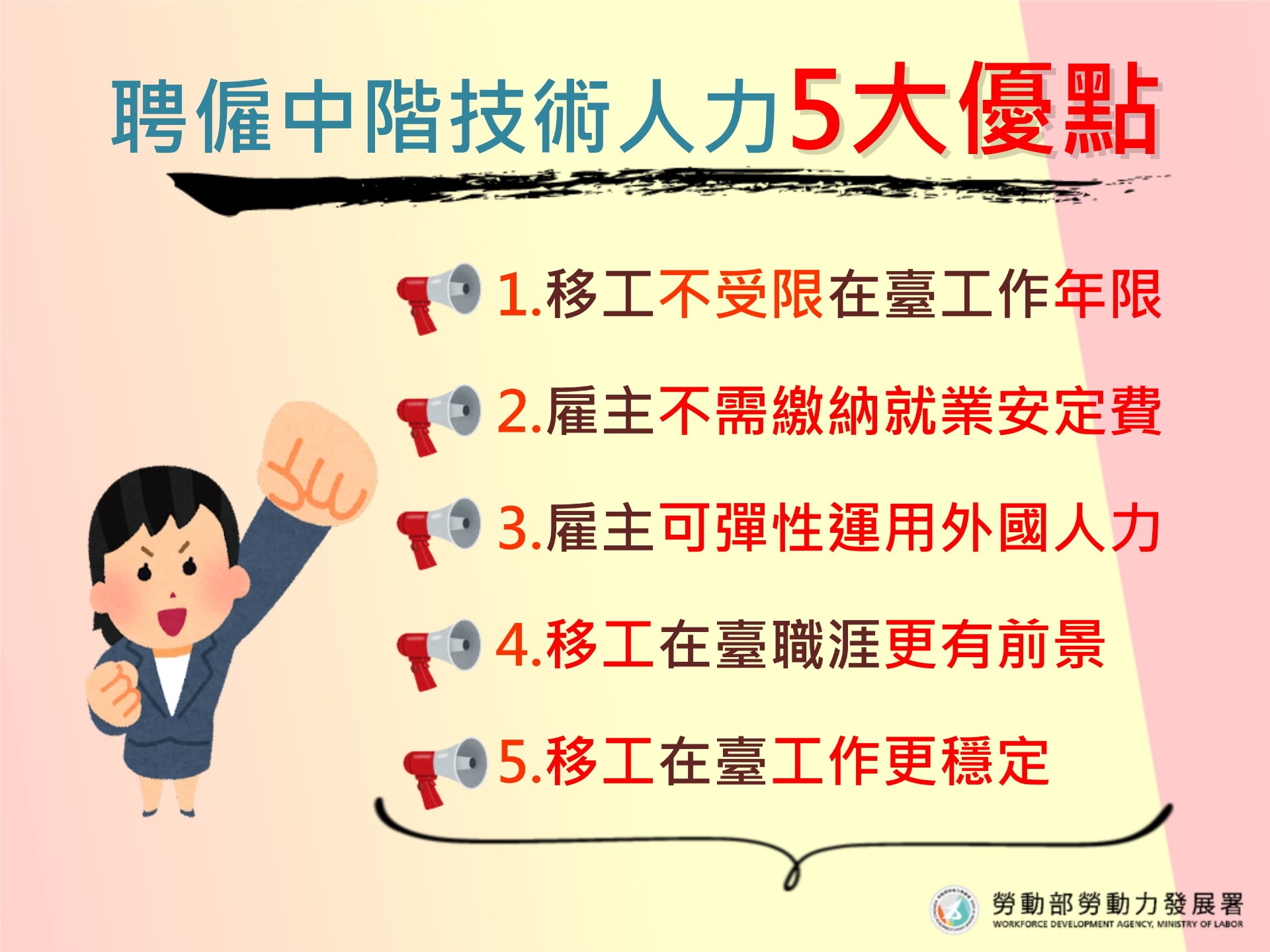 因應全球高齡化及少子化趨勢,勞動部推動「移工留才久用方案」,於確保國人就業機會的前提下,讓外國中階技術人力無在臺工作年限的限制,適時補充雇主所需長期穩定勞動力。「移工留才久用方案」自2022年4月30日起實施以來獲得各界肯定,符合申請條件的雇主均可提出申請,經統計截至2025年7月底止,雇主申請外國中階技術人力的人數共計5萬5,773人,已核准5萬1,925人。其中,產業類核准人數達到2萬593人、社福類核准人數更多達3萬1,332人,留用人數持續創新高,雇主與勞工共創雙贏。