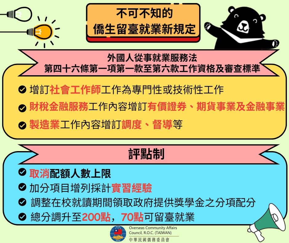 疫情後景氣回溫,各產業面臨缺工,勞動部跨部會合作擴大留用僑外生。首先2024年8月1日已取消僑外生從事白領專技工作評點配額制人數上限,提高僑外生留臺工作意願,2024年8月26日公告開放旅宿業聘僱副學士以上僑外生,從事旅宿業房務、清潔、訂房、接待及所屬餐廳外場工作;另年底前將跨部會協商修法,建立僑外生個人工作許可制,擴大留用僑外生補實各行業勞動力。