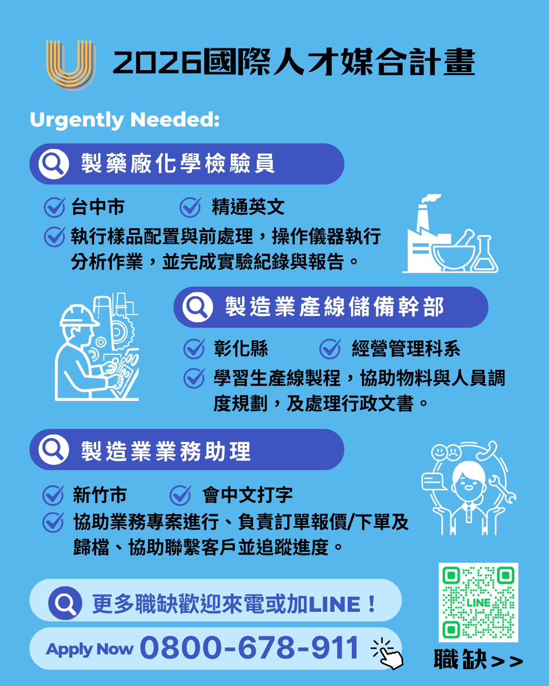 - 在地訓練.海外對接:適合在台灣總部培訓後,派駐至母國任職,或是擔任母國廠商接待翻譯