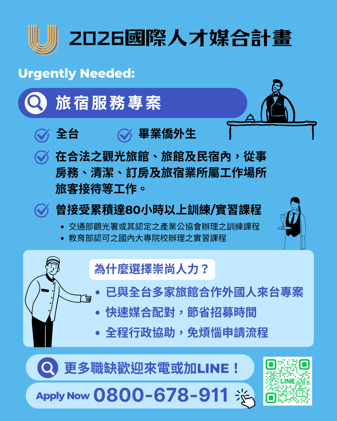- 外國技術人力:目前有開放工作類別為旅宿業、長照相關工作、製造業、營造業等等。