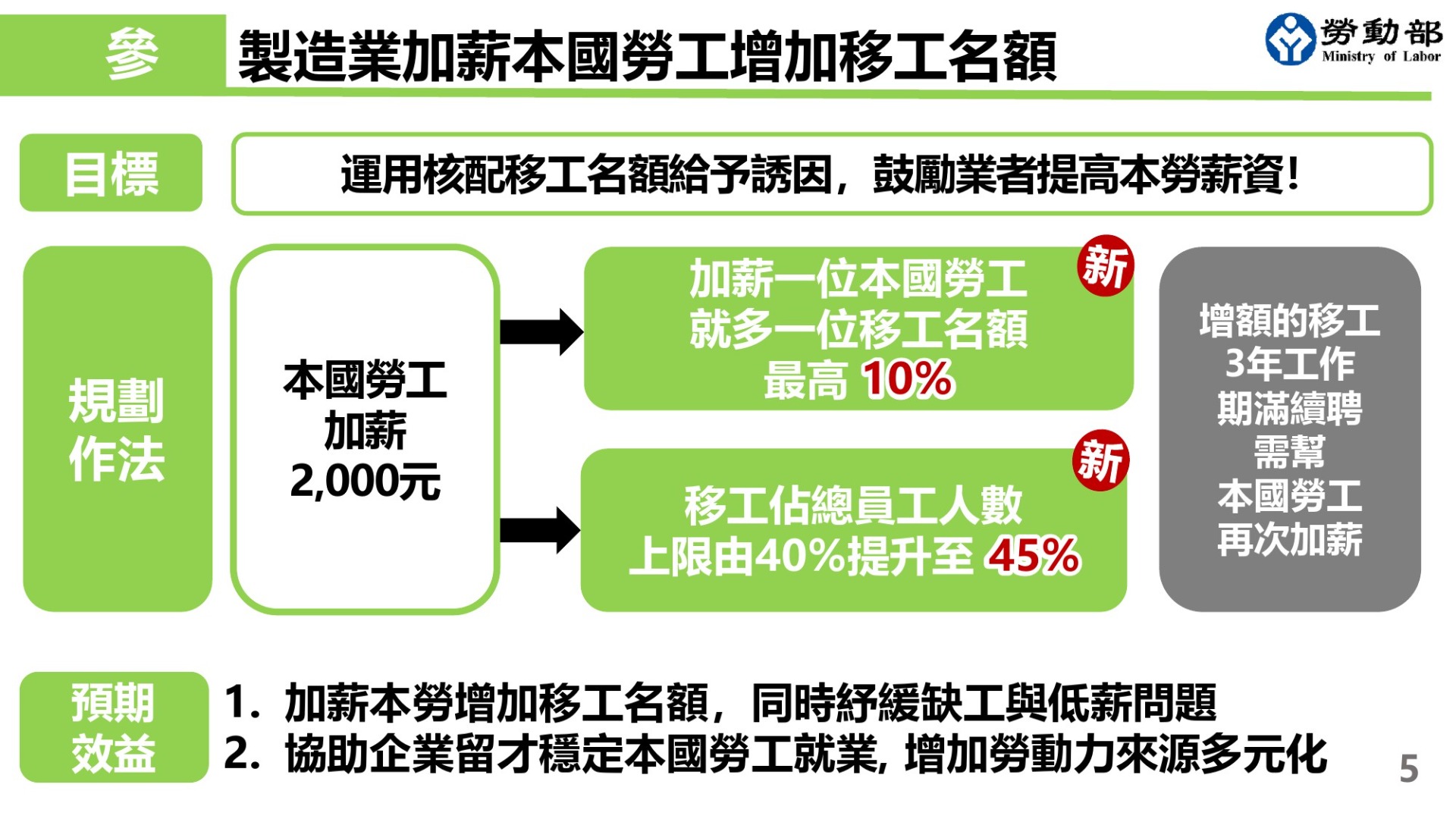 鼓勵企業將資深移工轉為中階技術人力,比重提高到100%。(所有外國人占比仍不得超過50% )