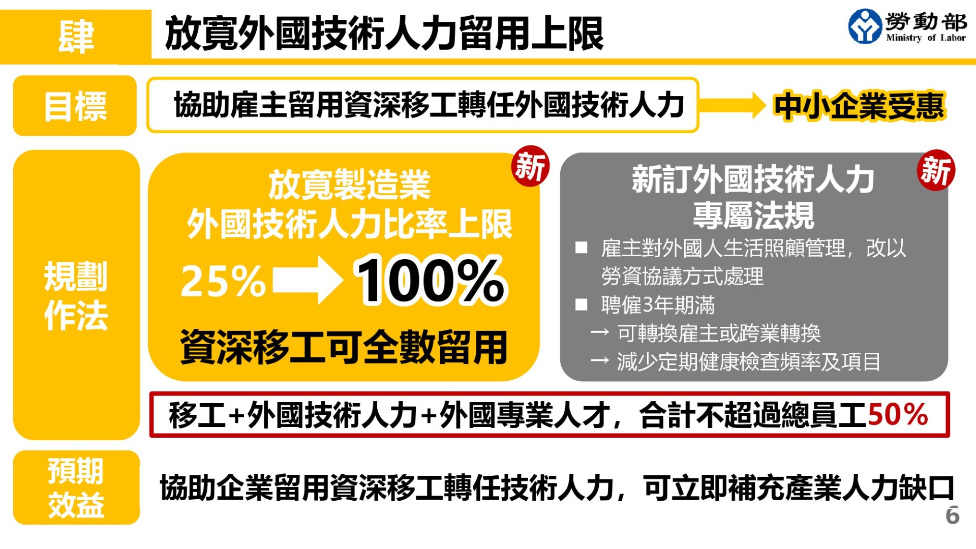 同時,企業將可彈性將現有資深移工轉為中階技術人力,不再受原25%上限限制,但外國人總比例不得超過全體員工五成。