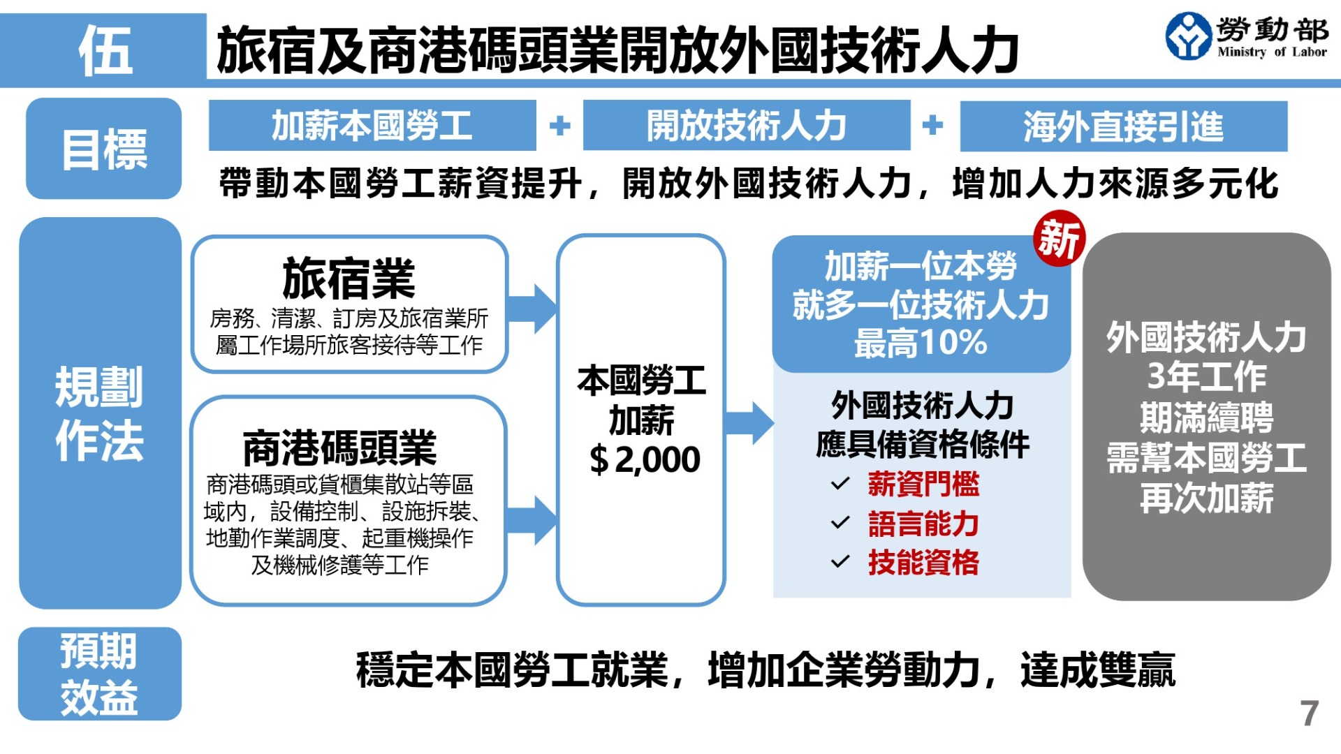 【114-10-30行政院新聞稿】 旅宿業及商港碼頭業引進外國技術人力:開放「旅宿服務工作」、「商港碼頭貨物裝卸集散工作」得聘僱外國技術人力且直接從海外引進,雇主為其聘僱全時本國籍工作者加薪,每加薪一位本國勞工就多一位外國技術人力名額,最高不得超過其勞保投保人數10%。