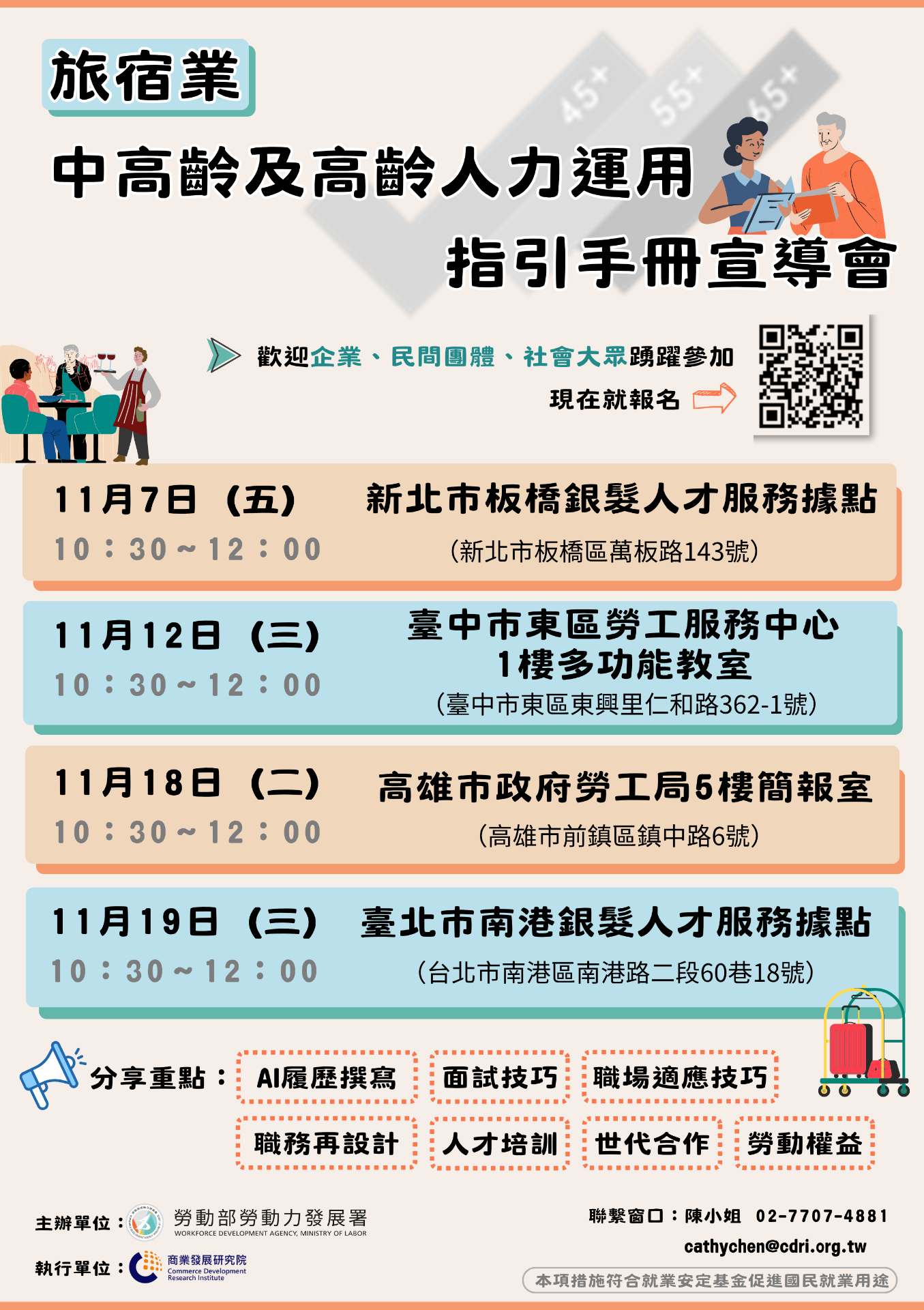 為了讓有興趣投入旅宿業的中高齡和高齡朋友,更了解這個行業的工作內容,勞動部勞動力發展署特別舉辦全台四場說明會,帶旅宿業者快速掌握《旅宿業中高齡及高齡人力運用指引手冊及職場指引手冊》的精華內容與實務應用!