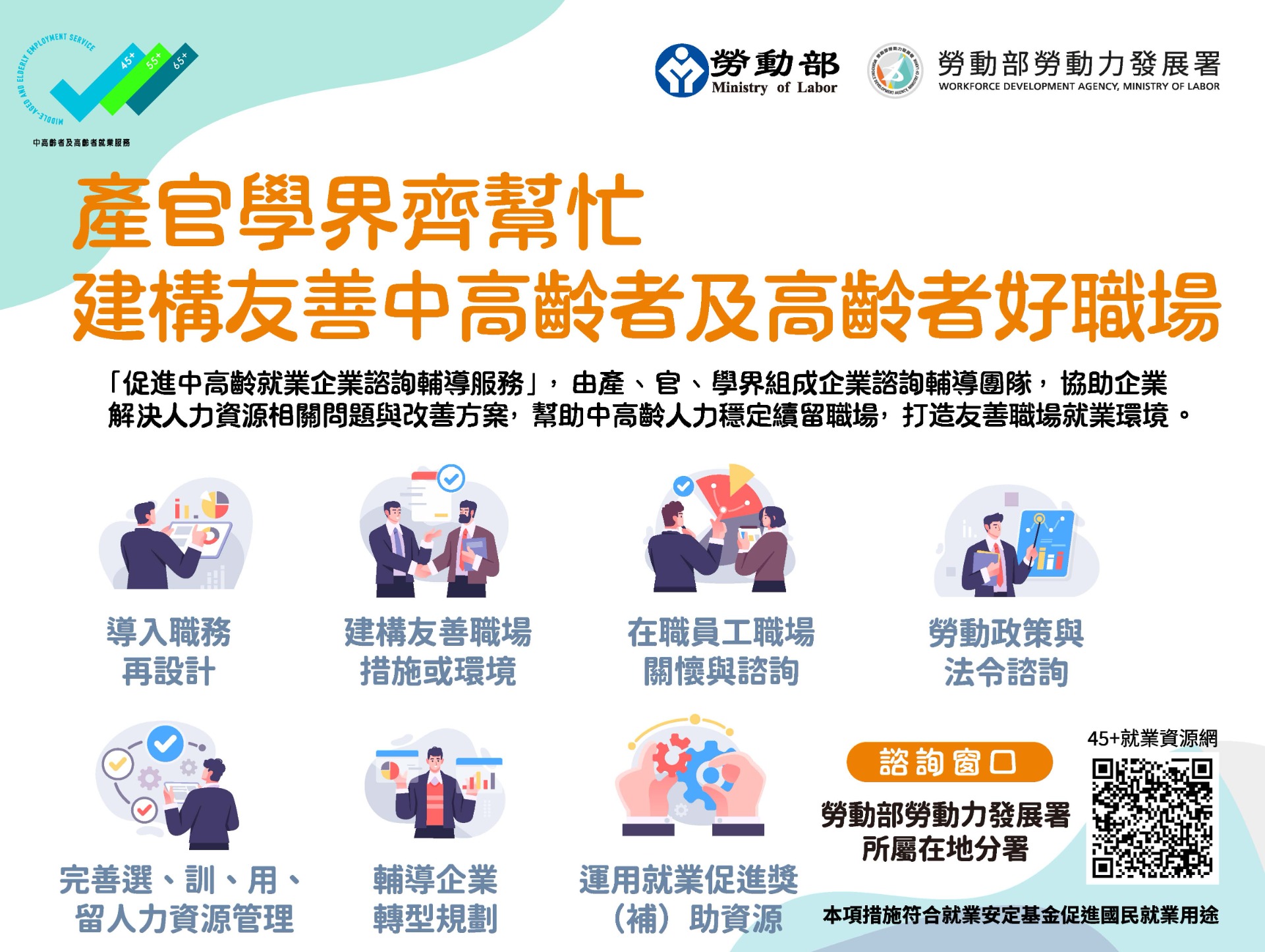 為因應超高齡社會,本署各分署推動「中高齡企業輔導團」服務,倡議世代共融合作,提供專業顧問諮詢輔導,進行企業診斷與輔導服務,協助企業穩定僱用中高齡者及高齡者,創造友善職場,提升企業競爭力。