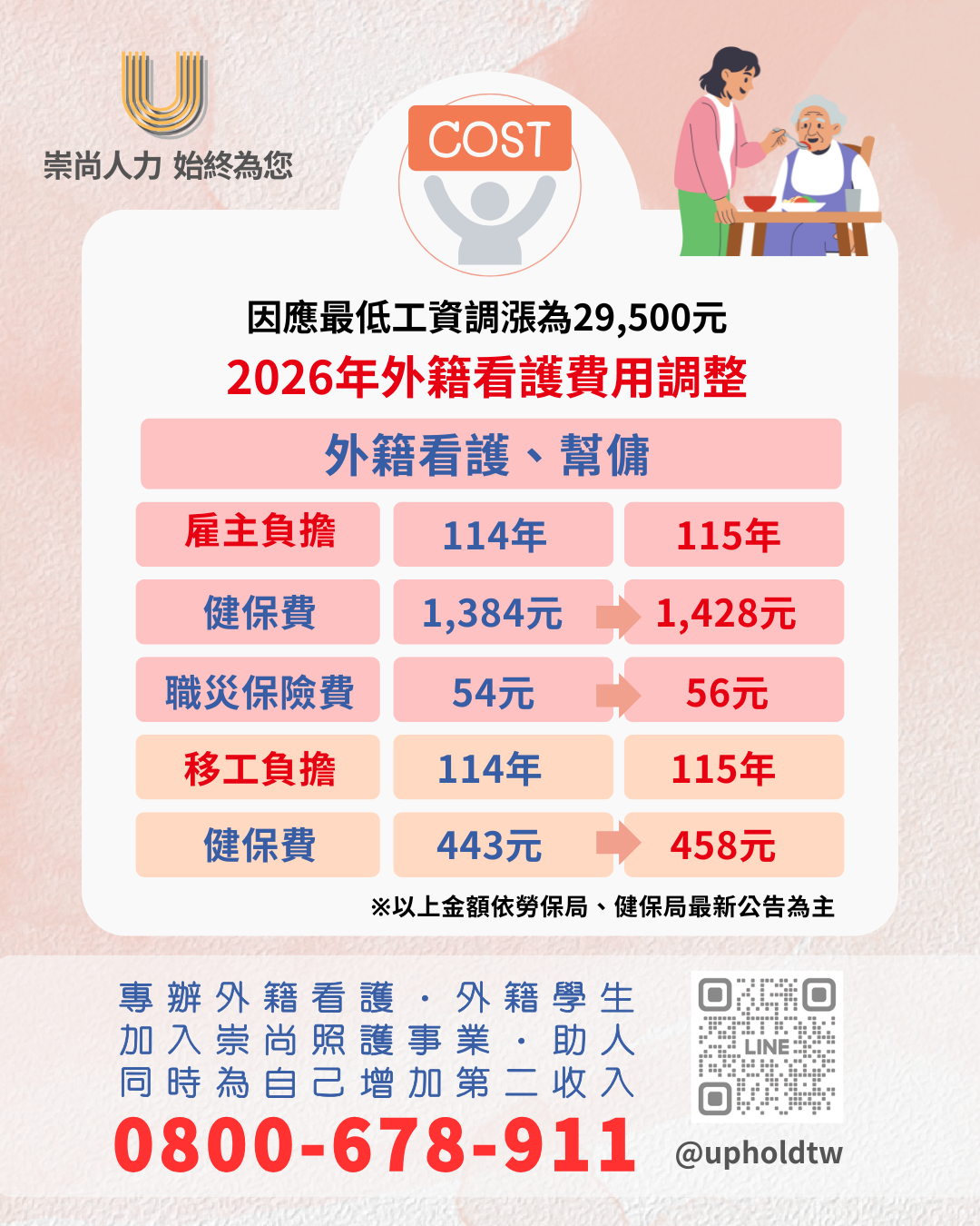 首先,因應2026年基本工資調整為29,500元,外籍看護雇主負擔健保費調整為1,428元、職災保險費調整為56元。移工負擔健保費調整為458元。
