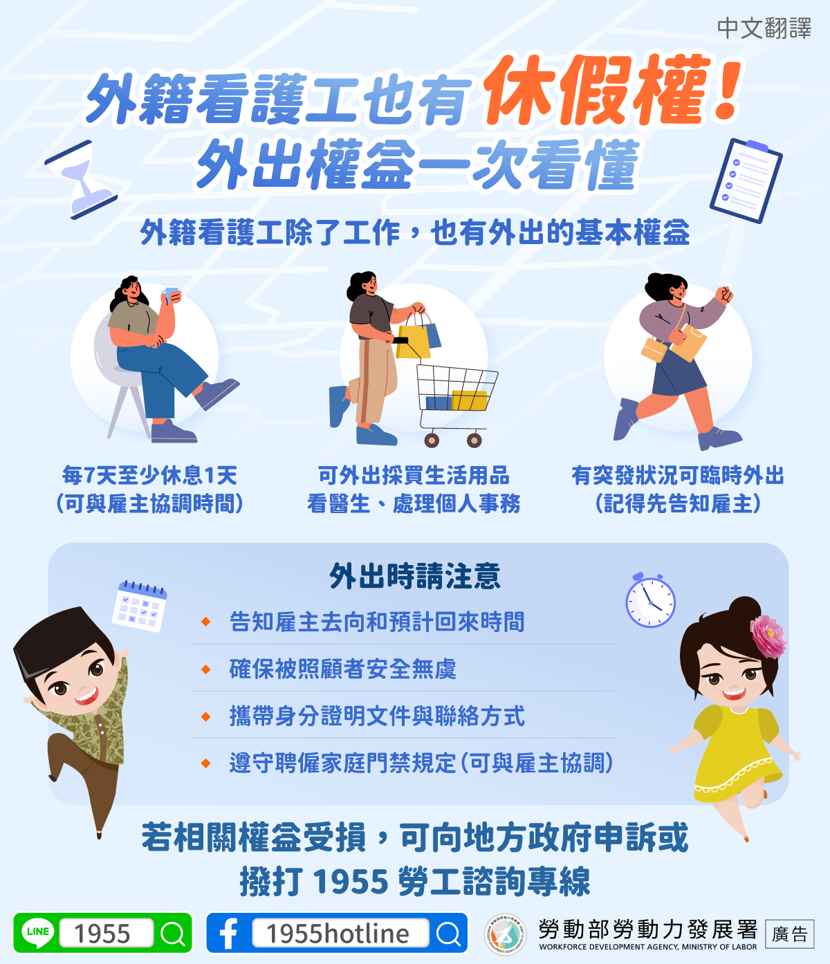 在許多家庭裡,外籍看護工肩負起照顧長者與身心障礙者的重要責任,長時間與被照顧者相處,往往容易被誤會「必須隨時待命」。然而,實際上看護工和所有勞工一樣,都擁有基本休息與外出的權益。