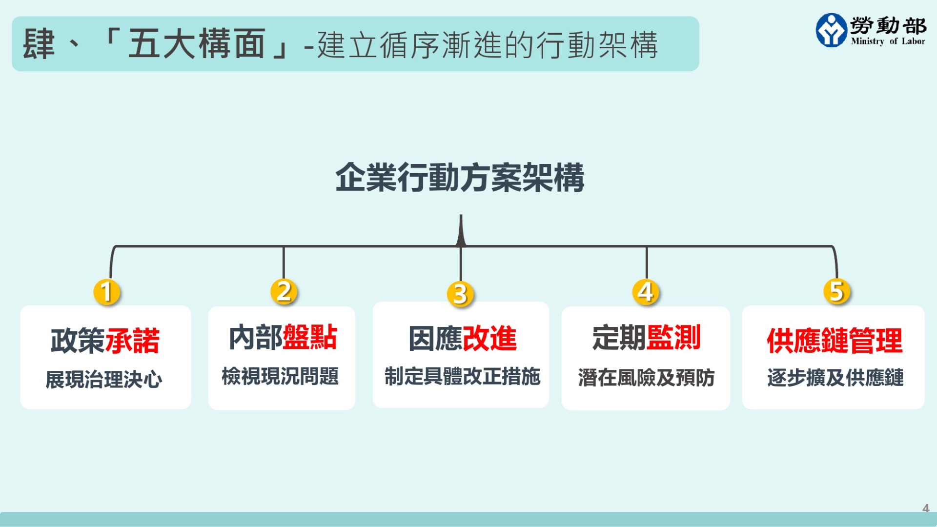 勞動部說明,該指引核心在引導企業從「自身」到「供應鏈」,循序漸進透過「五大構面」展開行動,首先企業應建立明確的「政策承諾」以展現治理決心,接著透過「內部現況盤點」與「辨識潛在風險」,將管理責任從自身企業及子公司逐步擴及至整體供應鏈及所合作的仲介機構 ,依據盤點後的結果去執行「因應與改善措施」,最後強化整體的「供應鏈管理」,將人權保障落實於公司治理。