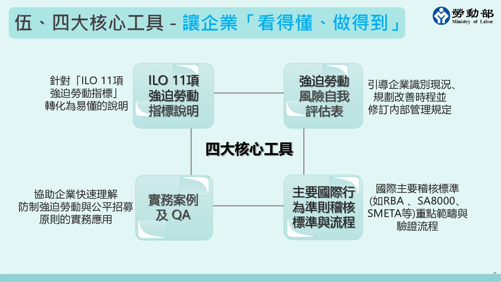 因應國際供應鏈對防制強迫勞動及公平招募原則的重視,勞動部於115年2月13日發布「企業防制強迫勞動參考指引」,協助我國企業進行風險辨識並降低企業營運風險。該指引將國際勞工組織(ILO)11項強迫勞動指標轉化為可操作的實務工具,透過「五大構面」建立循序漸進的行動架構,搭配「四大核心工具」引導企業從自身管理擴及供應鏈,逐步檢視現況、規劃改善方向,提升因應國際規範的準備度。