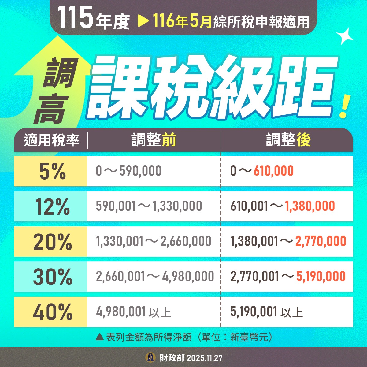 依《所得稅法》規定,綜合所得稅免稅額、標準扣除額、薪資所得特別扣除額、身心障礙特別扣除額、課稅級距及計算退職所得定額免稅之金額,每遇消費者物價指數較上次調整年度之指數上漲累計達3%以上時,按上漲程度調整。 115年度適用之平均消費者物價指數與113年度適用之指數相較,上漲4.13%,所以各項免稅額及扣除額調整如下,課稅級距也進行調整,納稅義務人於116年5月申報115年度綜合所得稅時適用。