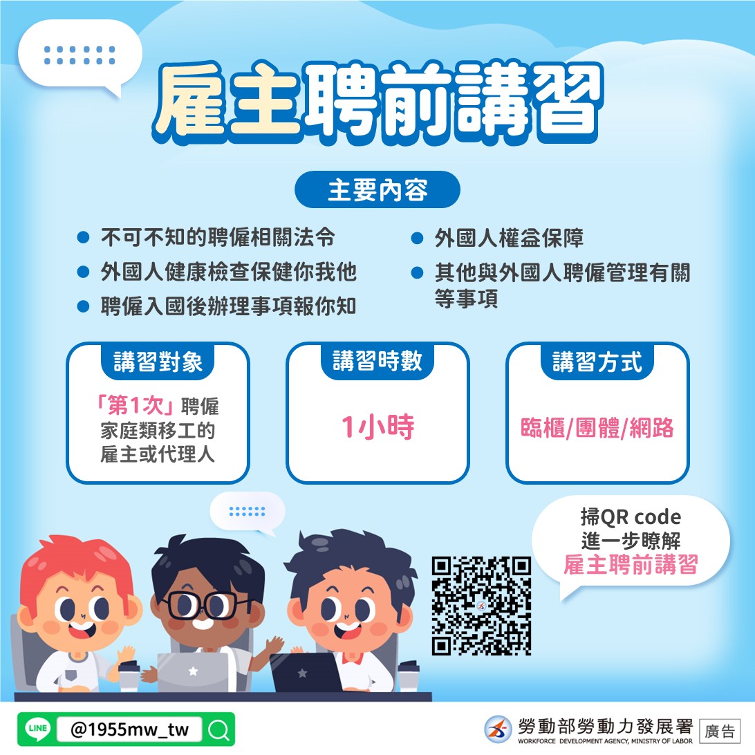 - 網路講習:參加講習者至勞動部勞動力發展署所建置之聘前講習網站,參加講習。【最多雇主選擇】